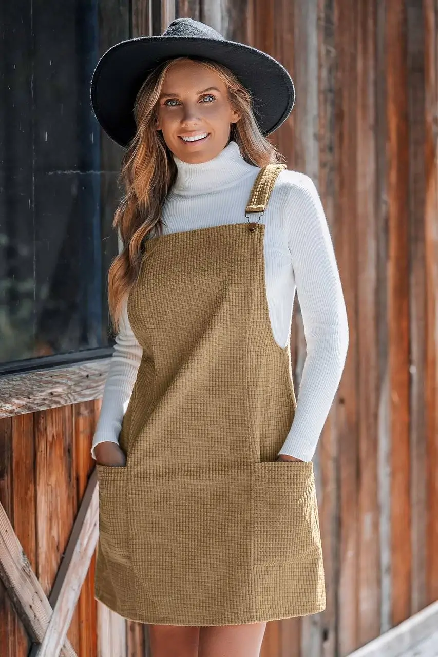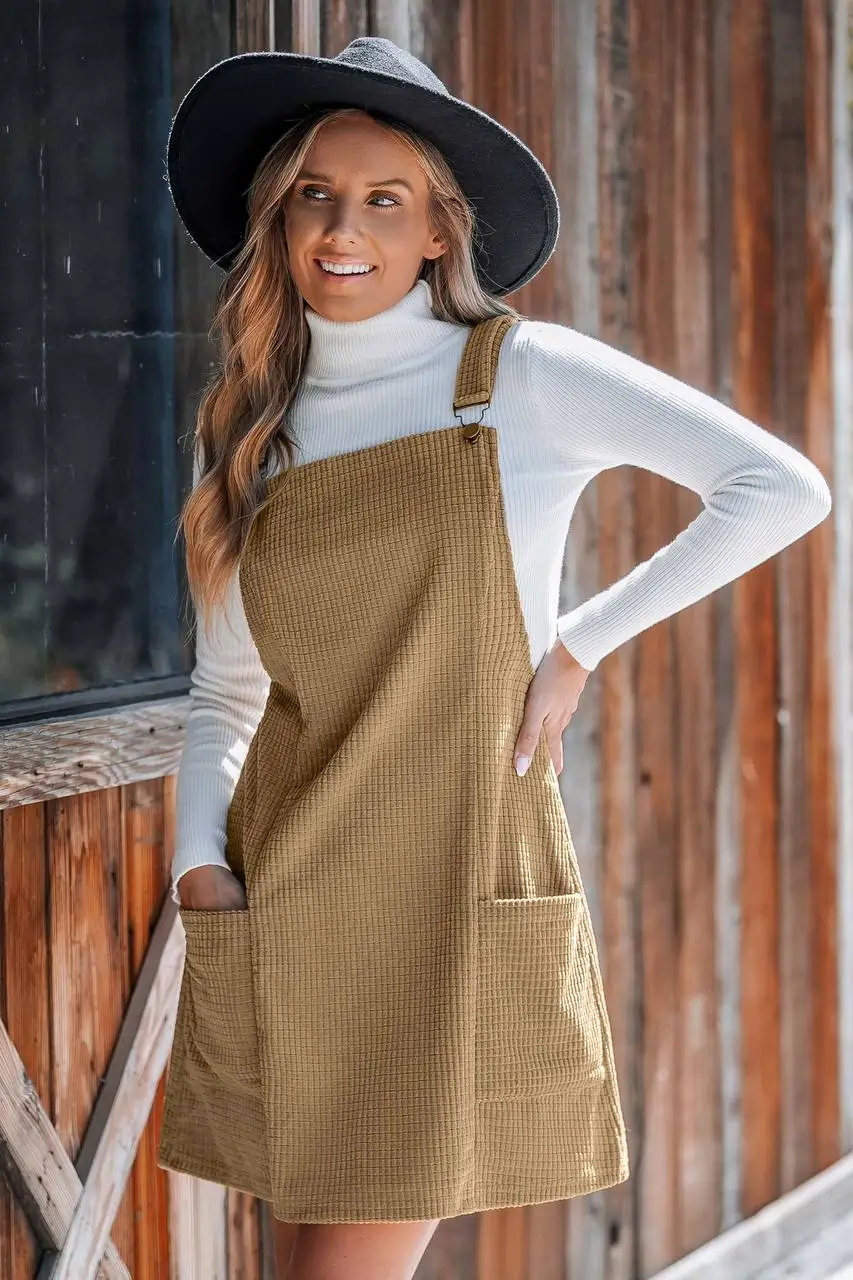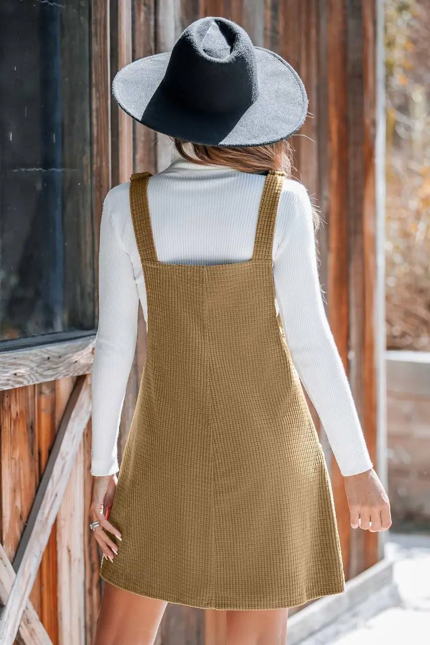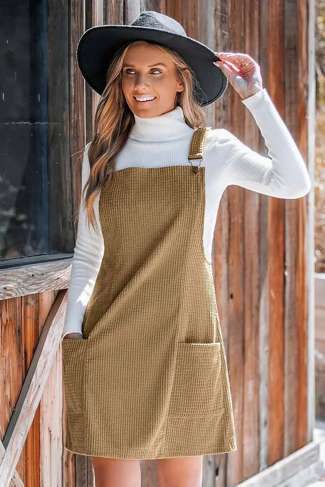 طراحی این سارافون به شکل اورالمینی (overall mini) است، با بندهای قابل تنظیم روی شانه (در بعضی مدلها) و جیبهای «پچ» (patch pocket) کاربردی در جلوی لباس. در صفحه محصول رسمی، اشاره شده به جیبهای جلویی (“patch pocket”) که باعث میشود این مدل علاوه بر ظاهر زیبا، کاربردی نیز باشد.